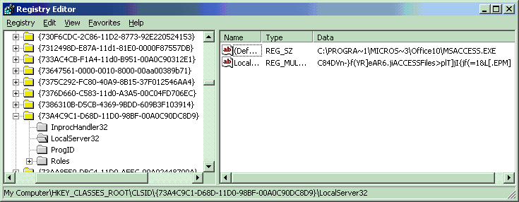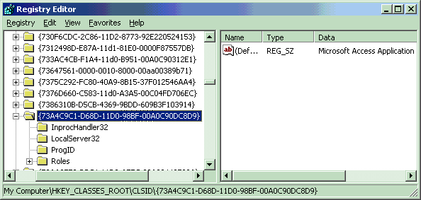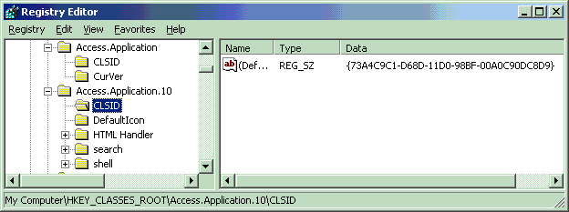 The Registry is structured as a tree with keys and subkeys. The key we're interested in is the topmost one, HKEY_CLASSES_ROOT (actually an alias for HKEY_LOCAL_MACHINE/Software/Classes). Expanding this key shows a bunch of subkeys, including file extensions, and if you scroll down a bit, Programmatic ID entries - ProgIDs - yes, these are what goes into the string argument for CreateObject and GetObject. These are the warm and fuzzy way to refer to your components: ProjectName.ClassName. Because the human imagination is limited, it's possible for duplication in ProgIDs. That's why there's another way of referring to components (in fact, if you do ActiveX control coding on HTML pages, it should look familiar...). Let's go to the one that says Access.Application.10 (yours might say .8 or .9 - I'm using Office XP) and click the CLSID folder. Off to the right we see a long code. This is the Class ID, or GUID (Globally Unique Identifier) - think of it as a Social Security number for components. (Again, your CLSID may be different depending on your version of Office.)