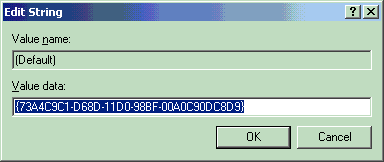 your computer saunters into the Registry and says, hey, I need one of these Access.Application.10 thingees. The Object Manager (think of this like the guy who works at the police evidence counter) says, sure, let me get you one of those. The OM looks up Access.Application.10 and sees that its Class ID is {73A4C9C1-D68D-11D0-98BF-00A0C90DC8D9}. cool. OK, but how is that information useful to anybody or anything? Let's see what we can find that matches this code. First, the OM copies the code to the clipboard by double-clicking the value.
