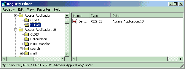...the path to the executable that opens MS Access! So, there we have it: how the ProgID leads to the executable that actually runs the desired component. This is why components have to be "registered" - the Registry contains the path to the executable. If you move a program, the Registry needs to know about it. One more thing - you may have wondered about the .10 (or .9 or .8) appended to Access.Application. Perhaps you've always used just Access.Application. The .10 is the specific version. If you don't use the specific version, it's okay, there is a subkey called Access.Application and it has a current version subkey which points to... .10 (or the last installed version of Access). You save a little bit of time by specifying the version you want to start with.