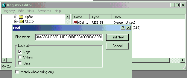 Now, the OM knows that all Class IDs are kept in a special subkey called, wittily enough, CLSID. (This is found alphabetically near the "C" ProgIDs.) He scrolls down and clicks that folder, and then brings up the Find dialog.