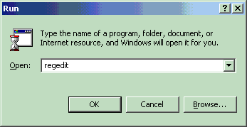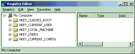 Windows 3.1 introduced the Registration Database for applications that used OLE (what they used to call COM). Eventually, Windows NT and Windows 9x were released with full-fledged Registries that are the central repository for all configuration information dealing with all hardware and software. The Registry is accessed in a consistent manner, is able to hold binary as well as string data and support multiple users and versions of software. It's securable and can be administered over a network. If it gets corrupted (it's a database and that's why you have to shut down as opposed to flipping the power switch - databases get corrupted if you don't close them properly), you're in trouble, but that's why we keep backups.... To access the Registry, we use the Run command, "regedit" (yes, NT/2000 has another editor but we won't worry about that one right now.) Let's try using regedit right now: